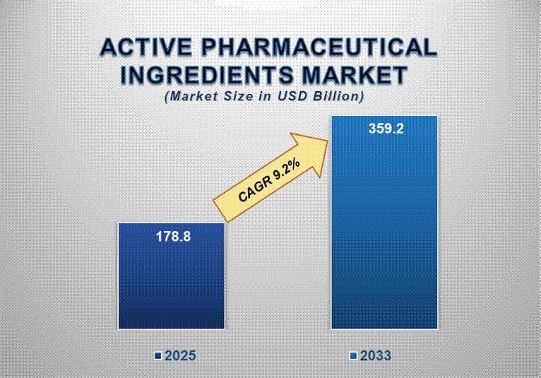 The Active Pharmaceutical Ingredients Market size is anticipated to experience substantial growth from 2025 to 2033. The rising demand for innovative and generic medicines is driving the growth of the active pharmaceutical ingredients market. With an estimated valuation of approximately USD 178.8 billion in 2025, the market is expected to reach USD 359.2 billion by 2033, registering a robust compound annual growth rate (CAGR) of 9.2% over the decade.
