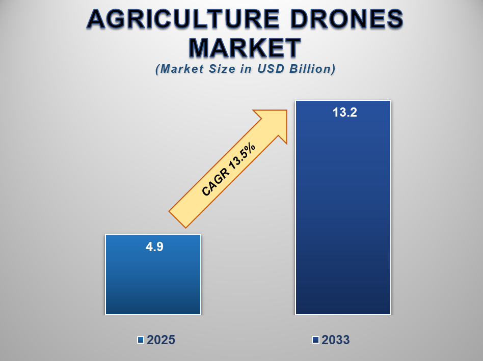 The Global Agriculture Drones Market is projected to grow significantly from USD 4.9 billion in 2025 to USD 13.2 billion by 2033, expanding at a CAGR of 13.5% during the forecast period. This rapid market expansion is driven by increasing demand for precision agriculture, the need for efficient farm management practices, and the rising global focus on food security.