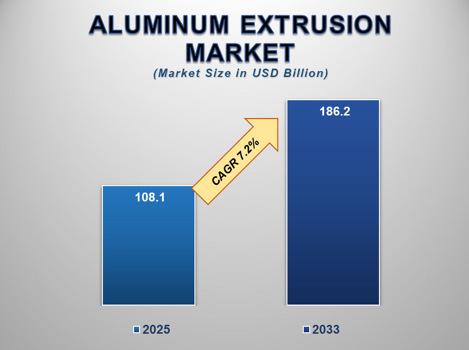 The global aluminum extrusion market is forecasted to grow from US$108.1 Billion in 2025 to US$186.2 Billion by 2033, expanding at a CAGR of 7.2% over the 2025–2033 period. This expansion is driven by increasing demand from key sectors, including construction, automotive, aerospace, electrical, and industrial manufacturing.