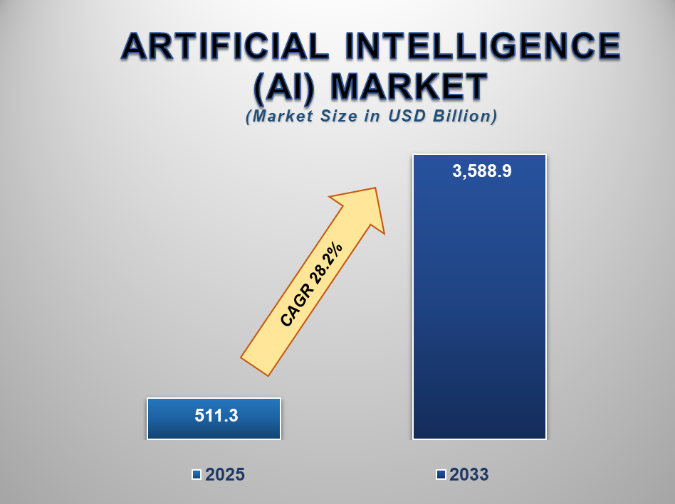 The global Artificial Intelligence (AI) Market size is experiencing rapid expansion, driven by exponential growth in data availability, advances in computing power, and widespread adoption of AI across industries. Valued at USD 511.3 billion in 2025, the market is projected to reach USD 3,588.9 billion by 2033, growing at a robust CAGR of 28.2% during the forecast period.