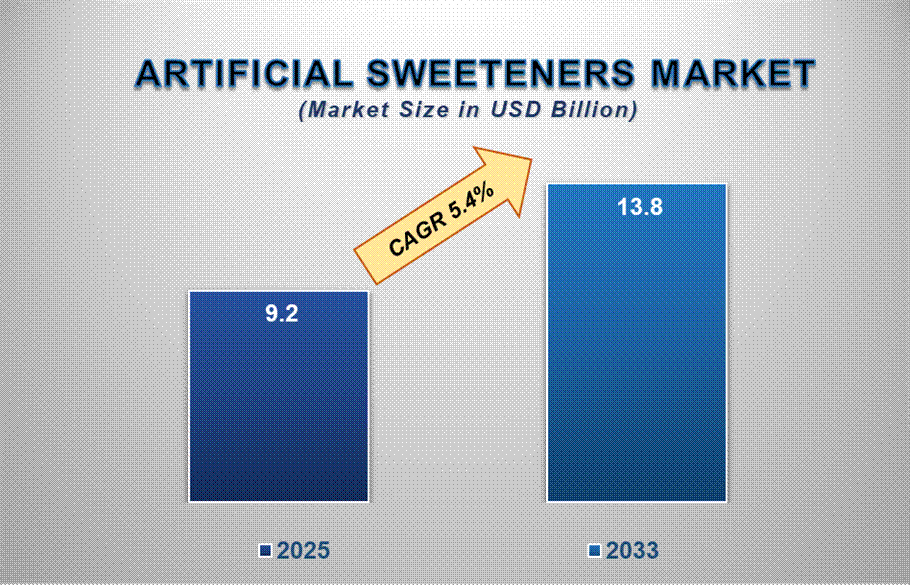 The artificial sweeteners market is projected to witness strong growth from 2025 to 2033, driven by rising health consciousness and the growing demand for low-calorie sugar substitutes. Valued at approximately USD 9.2 billion in 2025, the market is expected to reach USD 14.6 billion by 2033, exhibiting a robust CAGR of 5.9% during the forecast period.