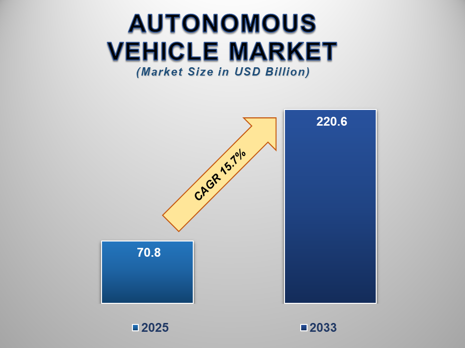 The global Autonomous Vehicle Market size is projected to grow significantly from USD 70.8 billion in 2025 to USD 220.6 billion by 2033, registering a robust CAGR of 15.7% during the forecast period. Autonomous vehicles, often referred to as self-driving or driverless cars, are equipped with advanced control systems, sensors, and software capable of performing driving functions with little or no human input.