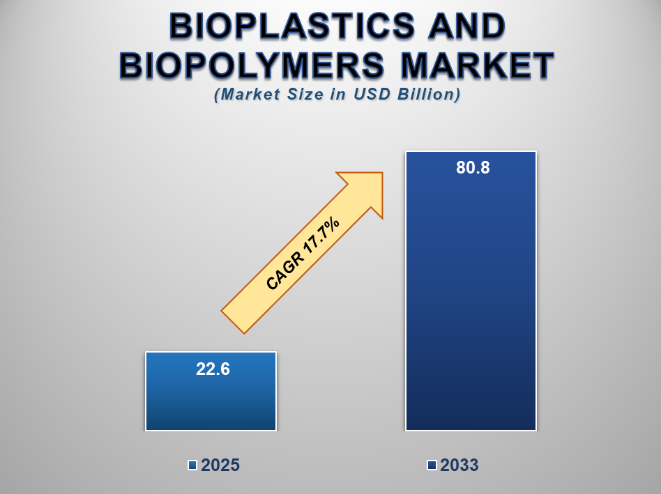 The global Bioplastics and Biopolymers Market was valued at USD 22.6 billion in 2025 and is projected to reach USD 80.8 billion by 2033, growing at a robust CAGR of 17.7% during the forecast period. As sustainability becomes a central theme across industries, bioplastics and biopolymers have emerged as essential alternatives to conventional petrochemical-based plastics. These materials are derived from renewable sources such as corn starch, sugarcane, cellulose, and other plant-based feedstocks and offer various environmental benefits including reduced carbon emissions and enhanced biodegradability.