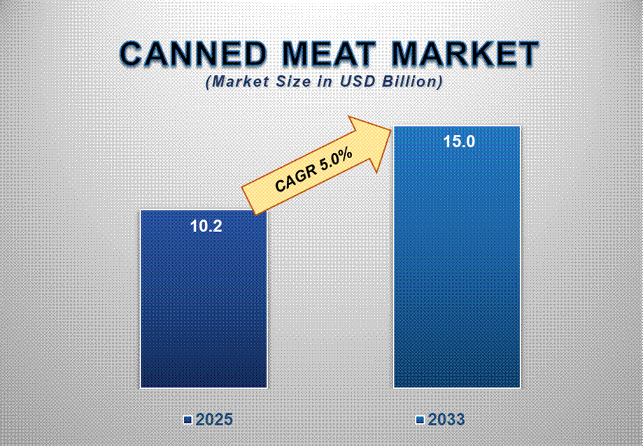 The Canned Meat Market size is anticipated to experience substantial growth from 2025 to 2033, fueled by growing demand for convenience food products and robust demand for animal protein. With an estimated valuation of approximately USD 10.2 billion in 2025, the market is expected to reach USD 15.0 billion by 2033, registering a robust compound annual growth rate (CAGR) of 5.0% over the decade.