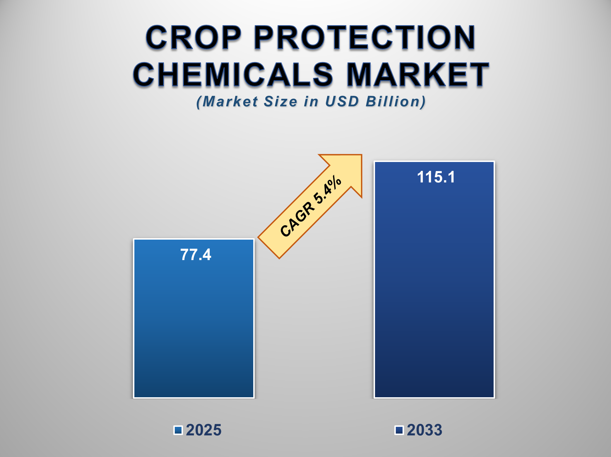 The Global Crop Protection Chemicals Market is projected to grow from USD 77.4 billion in 2025 to USD 115.1 billion by 2033, registering a CAGR of 5.4% during the forecast period. Market growth is driven by rising global food demand, increasing population, and the need to boost agricultural productivity through effective pest and disease control solutions.
