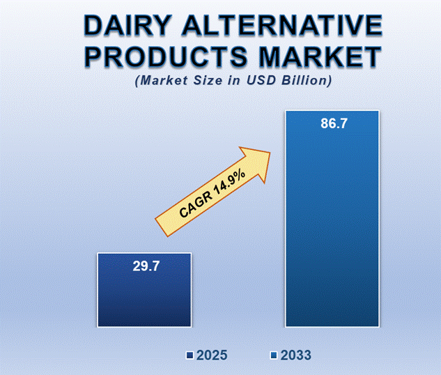 The Dairy alternative products market is anticipated to experience substantial growth from 2025 to 2033; the increasing incidence of lactose intolerance and dairy allergies are key factors propelling this growth. With an estimated valuation of approximately USD 29.7 billion in 2025, the market is expected to reach USD 86.7 billion by 2033, registering a robust compound annual growth rate (CAGR) of 14.9% over the decade.