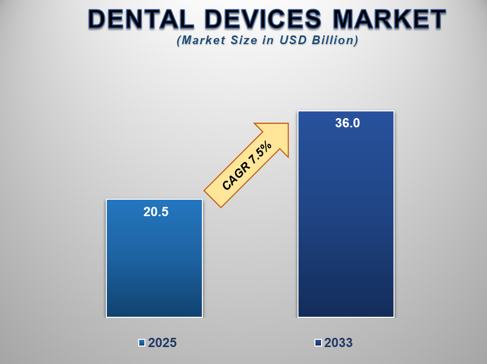 The global dental devices market was valued at USD 20.5 billion in 2025 and is projected to reach USD 36.0 billion by 2033, growing at a CAGR of 7.5% during the forecast period. Demand for advanced dental solutions continues to surge due to the rising prevalence of oral diseases, growing aesthetic dentistry trends, and technological advancements in dental care. Increasing awareness about oral hygiene, coupled with higher disposable incomes in emerging economies, has accelerated the adoption of innovative dental devices in both preventive and restorative dentistry.