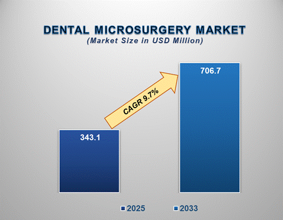 The dental microsurgery market is anticipated to experience substantial growth from 2025 to 2033, increasing demand for cosmetic and restorative dentistry and the rising prevalence of dental diseases. With an estimated valuation of approximately USD 343.1 Million in 2025, the market is expected to reach USD 706.7 Million by 2033, registering a robust compound annual growth rate (CAGR) of 9.7% over the decade.