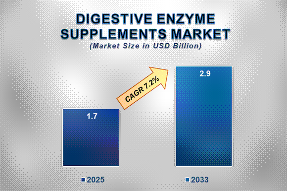 The digestive enzyme supplements market is projected to witness substantial growth between 2025 and 2033, primarily fueled by changing dietary patterns and increasing concerns about gastrointestinal health. The market is anticipated to reach approximately USD 1.7 billion by 2025 and expand further to nearly USD 2.9 billion by 2033, registering a compound annual growth rate (CAGR) of 7.2% during the forecast period.
