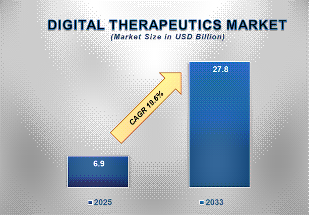 The digital therapeutics market is projected to witness significant growth from 2025 to 2033. The digital therapeutics (DTx) market is gaining demand due to its potential for cost-effective, scalable, and evidence-based treatment options, especially for chronic diseases. Valued at approximately USD 6.9 billion in 2025, the market is anticipated to reach USD 27.8 billion by 2033, reflecting a strong compound annual growth rate (CAGR) of 19.6% over the next ten years.