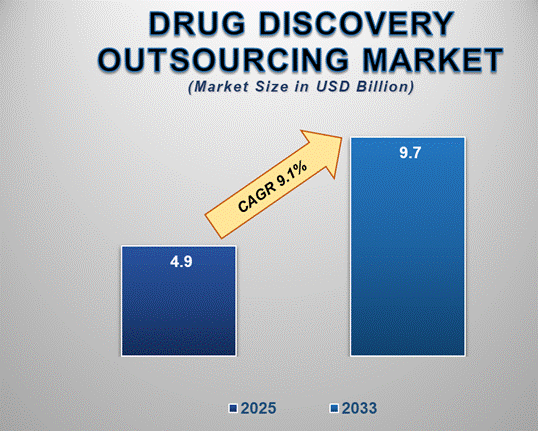 The drug discovery outsourcing market is projected to witness significant growth from 2025 to 2033, driven by the increasing volume of clinical trials and ongoing innovations in drug discovery technologies. Valued at approximately USD 4.9 billion in 2025, the market is expected to nearly double, reaching USD 9.7 billion by 2033, reflecting a strong compound annual growth rate (CAGR) of 9.1% during the forecast period.