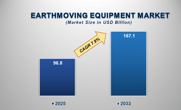 The global earthmoving equipment market is projected to experience strong growth over the forecast period, driven by rising infrastructure development, increased mining activities, and mechanization in agriculture and construction. Valued at USD 96.8 billion in 2025, the market is expected to reach USD 167.1 billion by 2033, growing at a CAGR of 7.9% from 2025 to 2033.