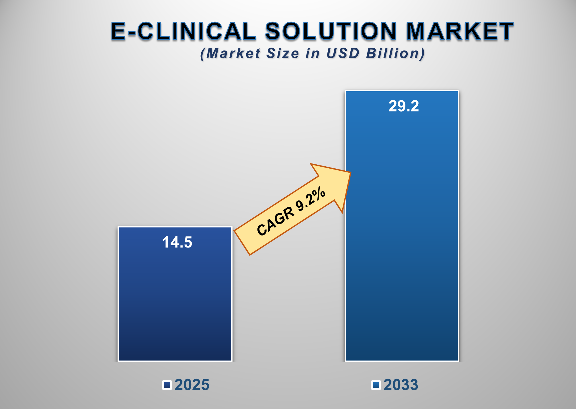 The eClinical Solutions Market is positioned for a period of dynamic and technologically driven growth from 2025 to 2033, fueled by the increasing complexity of clinical trials, a strong pipeline of new therapies, the global shift towards decentralized trials, and the imperative for greater efficiency and data quality in drug development. The market is projected to be valued at approximately USD 14.5 billion in 2025 and is forecasted to reach nearly USD 29.2 billion by 2033, exhibiting a compound annual growth rate (CAGR) of 9.2% during this period.