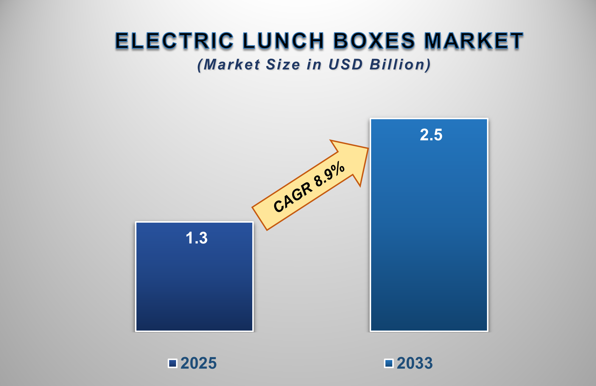 The Electric Lunch Boxes Market size is projected to witness robust growth from 2025 to 2033, propelled by the escalating demand for biopharmaceuticals, stringent regulatory requirements for drug safety and food quality, and increasing investment in life sciences R&D. Valued at approximately USD 1.3 billion in 2025, the market is expected to surge to USD 2.5 billion by 2033, reflecting a steady compound annual growth rate (CAGR) of 8.9% over the forecast period.