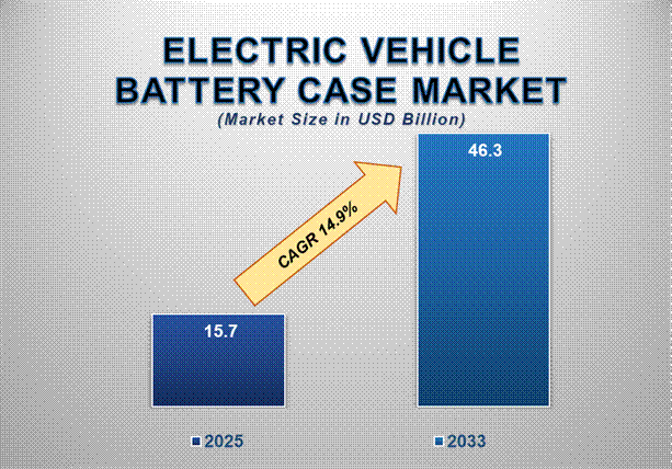The electric vehicle battery case market is anticipated to experience substantial growth from 2025 to 2033, rising adoption of electric vehicles and the need for robust and safe battery enclosures driving the electric vehicle battery case market. With an estimated valuation of approximately USD 15.7 billion in 2025, the market is expected to reach USD 46.3 billion by 2033, registering a robust compound annual growth rate (CAGR) of 14.9% over the decade.