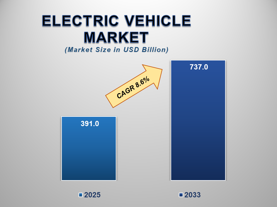 The global Electric Vehicle (EV) market is poised to grow from USD 391.0 Billion in 2025 to USD 737.0 Billion by 2033, expanding at a CAGR of 8.6%. The transition from fossil fuel-based transportation to electric mobility is being driven by a combination of government policy mandates, environmental sustainability goals, and rapidly evolving battery technologies. Electrification is no longer confined to luxury passenger cars but extends to scooters, commercial trucks, buses, and even three-wheelers, especially in urban economies.