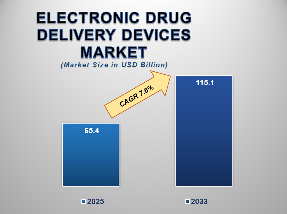 The global Electronic Drug Delivery Devices market is projected to reach US$ 115.1 Billion by 2033, rising from US$ 65.4 Billion in 2025, expanding at a CAGR of 7.6% during the forecast period (2025–2033). The market growth is primarily driven by the increasing prevalence of chronic diseases, advancements in digital health technologies, and the rising preference for self-administration and remote monitoring of therapeutics.