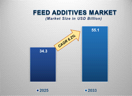 The global feed additives market is witnessing notable growth driven by the market growth supported by improving animal nutrition awareness, increasing urbanization, and government-backed livestock development programs. Valued at USD 34.3 billion in 2025, the market is projected to reach USD 55.1 billion by 2033, expanding at a CAGR of 6.2% during the forecast period.