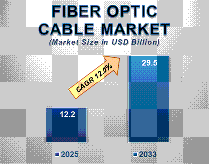 The global Fiber Optic Cable market is projected to reach US$ 29.5 Billion by 2033 from US$ 12.2 Billion in 2025. The market is expected to register a CAGR of 12.0% from 2025 to 2033. This growth is primarily driven by the escalating demand for high-speed internet connectivity, expanding data center infrastructure, and the rapid proliferation of connected devices worldwide.
