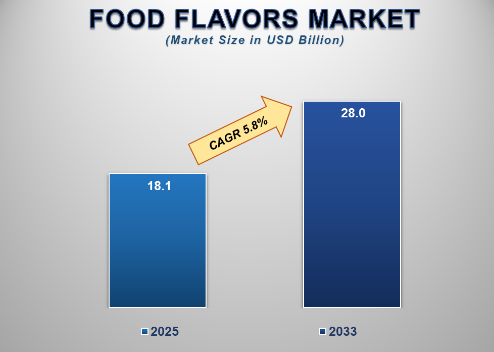 The Global Food Flavors Market size is witnessing steady growth, driven by evolving consumer preferences, increasing demand for natural and clean-label products, and continuous innovation in flavor technologies. According to market analysis, the Food Flavors Market is projected to grow from USD 18.1 billion in 2025 to USD 28.0 billion by 2033, registering a compound annual growth rate (CAGR) of 5.8% during the forecast period.