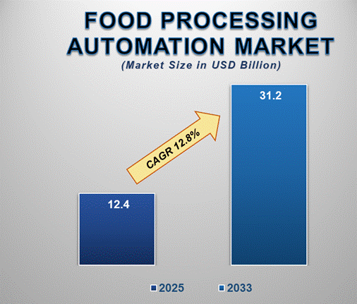 The food processing automation market is anticipated to experience substantial growth from 2025 to 2033, increase in the adoption of automation technologies in the food and beverage industry are being a key factor propelling this growth. With an estimated valuation of approximately USD 12.4 billion in 2025, the market is expected to reach USD 31.2 billion by 2033, registering a robust compound annual growth rate (CAGR) of 12.8% over the decade.
