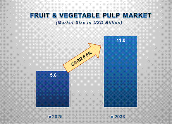 The global fruit and vegetable pulp market is projected to grow steadily between 2025 and 2033, driven by rising health consciousness, demand for natural ingredients, and expanding food processing industries. Valued at approximately USD 5.6 billion in 2025, the market is expected to reach USD 11.0 billion by 2033, expanding at a CAGR of 8.8% over the forecast period.
