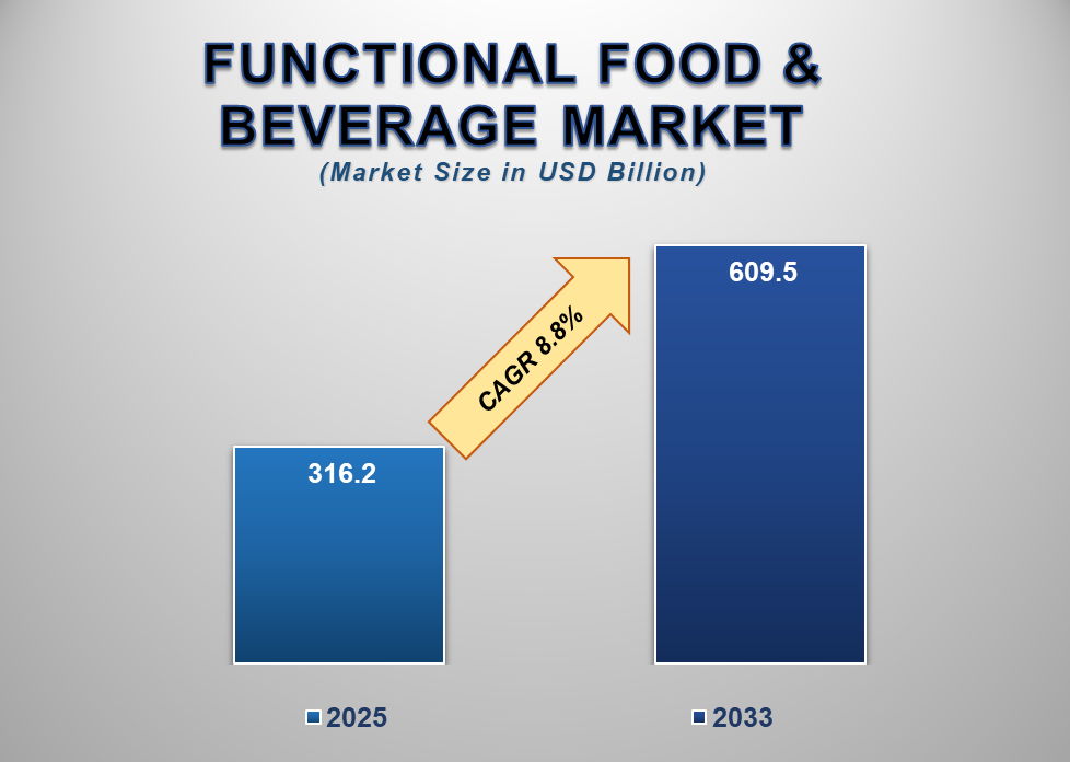 The global Functional Food and Beverage market is projected to grow from USD 316.2 Billion in 2025 to USD 609.5 Billion by 2033, expanding at a CAGR of 8.8% during the forecast period. This robust growth is primarily fueled by rising consumer awareness about preventive health, increasing incidence of lifestyle-related diseases, and an accelerated shift toward health-centric diets. Functional foods and beverages are enriched with added nutrients or biologically active ingredients such as vitamins, minerals, probiotics, prebiotics, amino acids, fiber, and antioxidants, aimed at providing health benefits beyond basic nutrition.