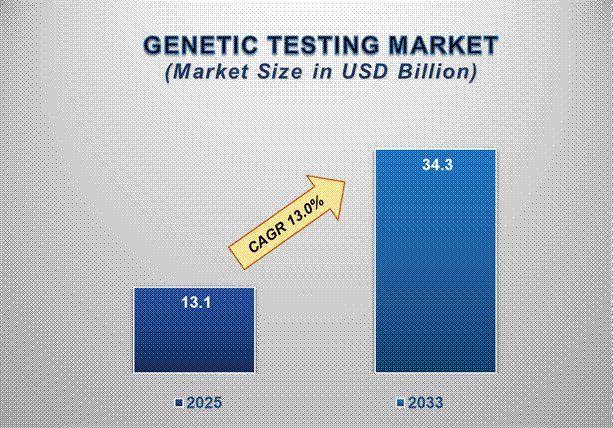 The global genetic testing market is set to witness remarkable growth from 2025 to 2033. Genetic testing is increasingly in demand due to rising awareness of its potential in diagnosing, predicting, and managing diseases. The Genetic Testing Market at around USD 13.1 billion in 2025, and the market shall reach around USD 34.3 billion by 2033 at a healthy compound annual growth rate of 13.0% over a decade.