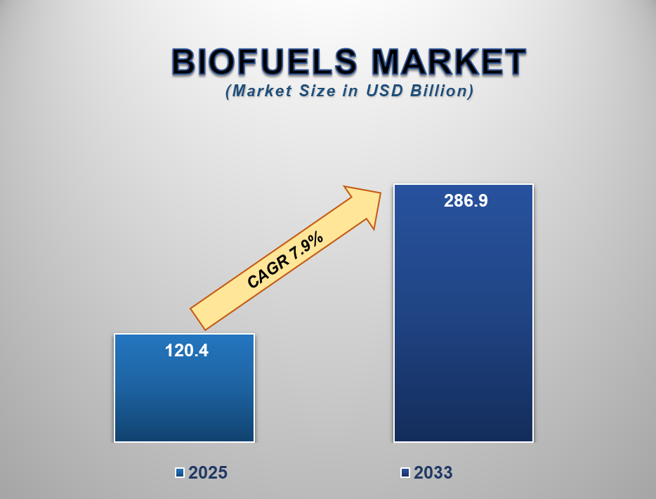 The global Biofuels market is projected to reach US$ 286.9 Billion by 2033 from US$ 120.4 Billion in 2025. The market is expected to register a CAGR of 7.9% from 2025–2033. This growth is primarily driven by the rising demand for sustainable and cleaner alternatives to conventional fossil fuels.