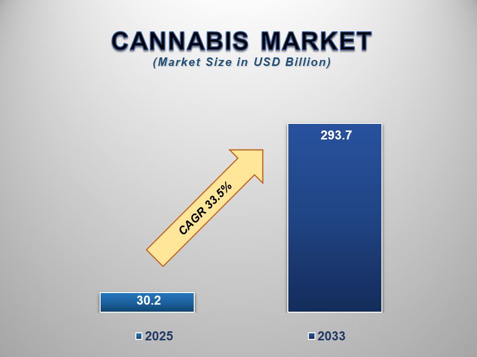 The Global Cannabis Market size is experiencing transformative growth driven by rising medical adoption, increasing legalization, and growing consumer acceptance. According to market analysis, the Cannabis Market is projected to grow from USD 30.2 billion in 2025 to USD 293.7 billion by 2033, expanding at a robust compound annual growth rate (CAGR) of 33.5% during the forecast period.