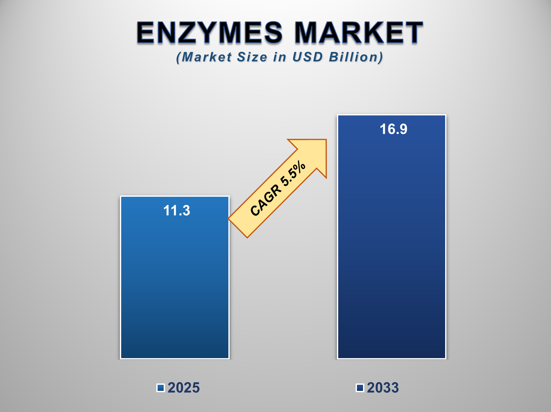 The Global Enzymes Market is projected to grow from USD 11.3 billion in 2025 to USD 16.9 billion by 2033, expanding at a CAGR of 5.5% during the forecast period. Growth is driven by the rising demand for sustainable, efficient, and eco-friendly solutions across industries such as food and beverages, pharmaceuticals, biofuels, and animal feed.