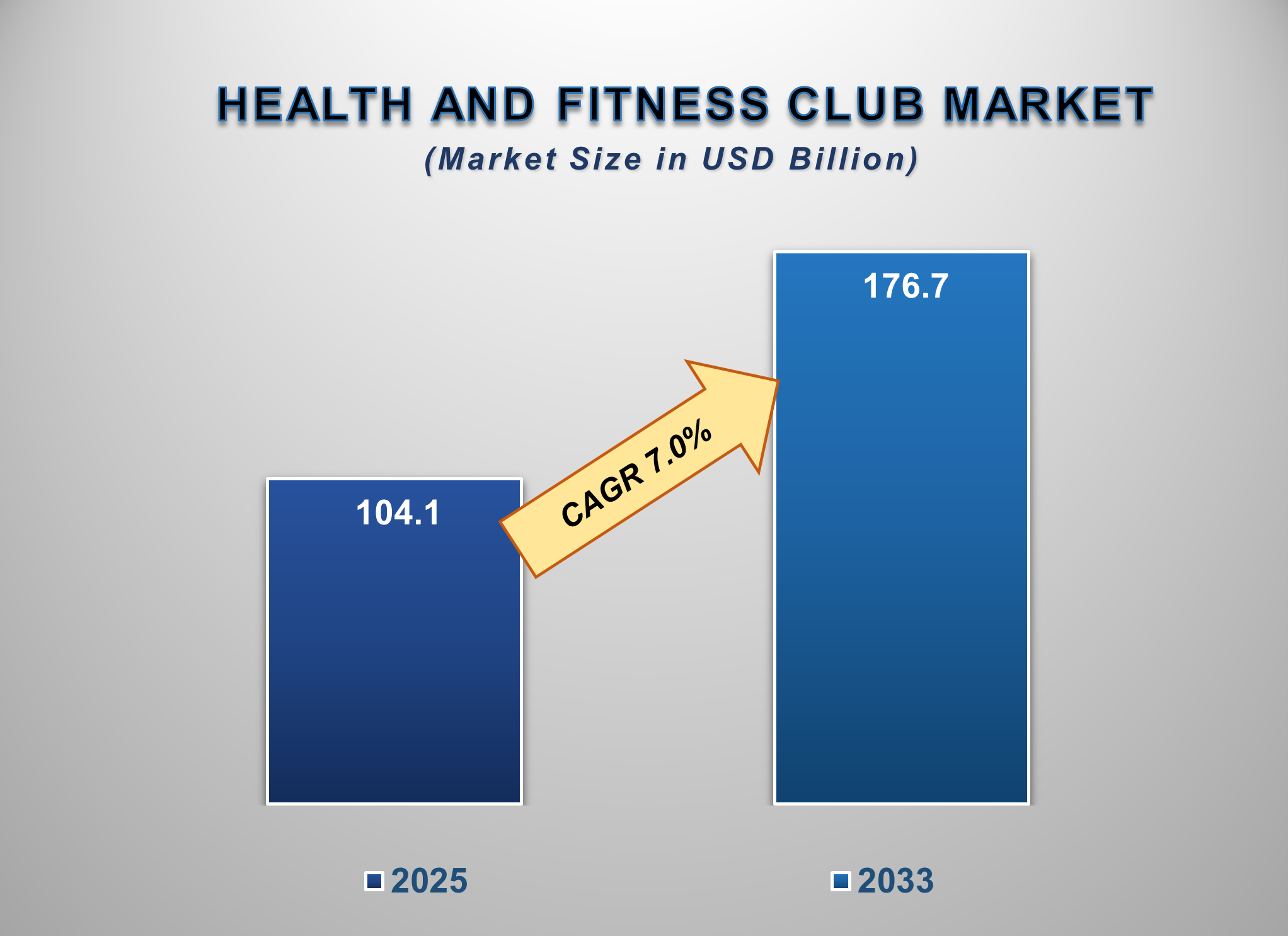 The global health and fitness club market size is projected to witness robust growth from 2025 to 2033, propelled by rising health consciousness, increasing disposable income, and a growing focus on preventative healthcare. Valued at approximately USD 104.1 billion in 2025, the market is expected to surge to USD 176.7 billion by 2033, reflecting a steady compound annual growth rate (CAGR) of 7.0% over the forecast period.