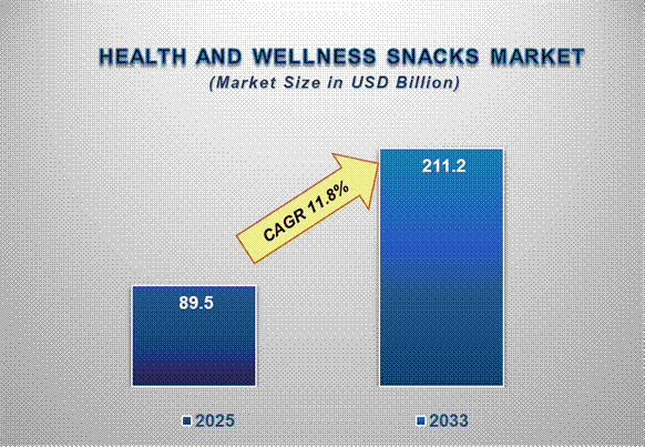 The global health and wellness snacks market is projected to grow steadily from 2025 to 2033, fuelled by increasing health awareness, rising demand for functional nutrition, and the shift toward clean-label and plant-based ingredients. Valued at approximately USD 89.5 billion in 2025, the market is expected to reach USD 211.2 billion by 2033, growing at a CAGR of 11.8% over the forecast period.