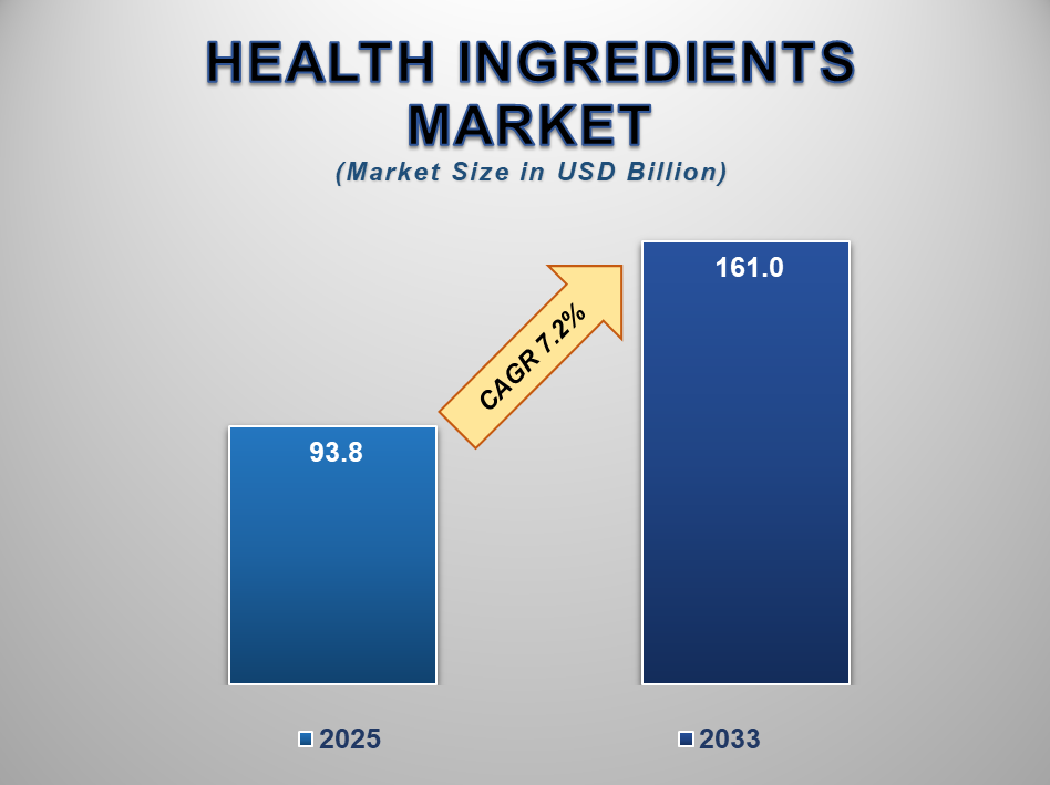 The Global Health Ingredients Market is witnessing strong growth, driven by rising consumer focus on nutrition, increasing prevalence of lifestyle diseases, and a surging demand for natural and functional foods. Valued at USD 93.8 billion in 2025, the market is projected to reach USD 161.0 billion by 2033, growing at a CAGR of 7.2% during the forecast period.