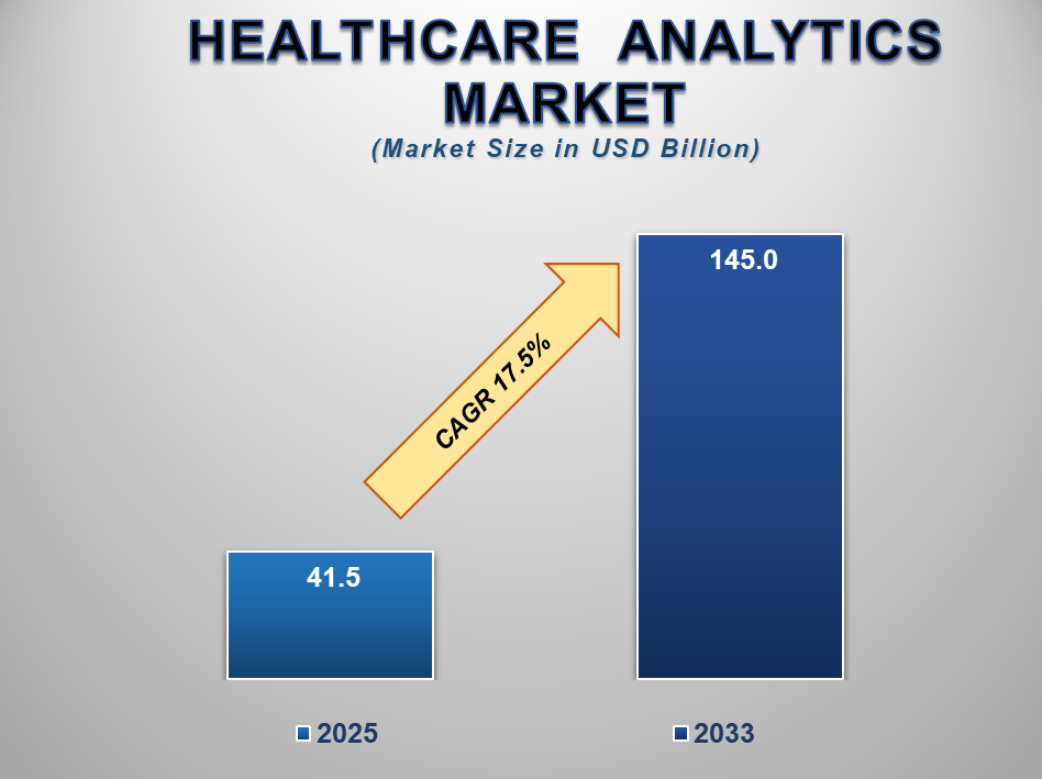 The global Healthcare Analytics Market is projected to grow significantly from USD 41.5 billion in 2025 to USD 145.0 billion by 2033, registering a robust CAGR of 17.5% during the forecast period. Healthcare analytics plays a transformative role in modern healthcare systems by enabling data-driven decision-making across clinical, operational, and financial domains. Rising healthcare expenditures, the growing complexity of care delivery, increasing demand for value-based care, and the widespread adoption of electronic health records (EHRs) are fueling the demand for healthcare analytics solutions globally.