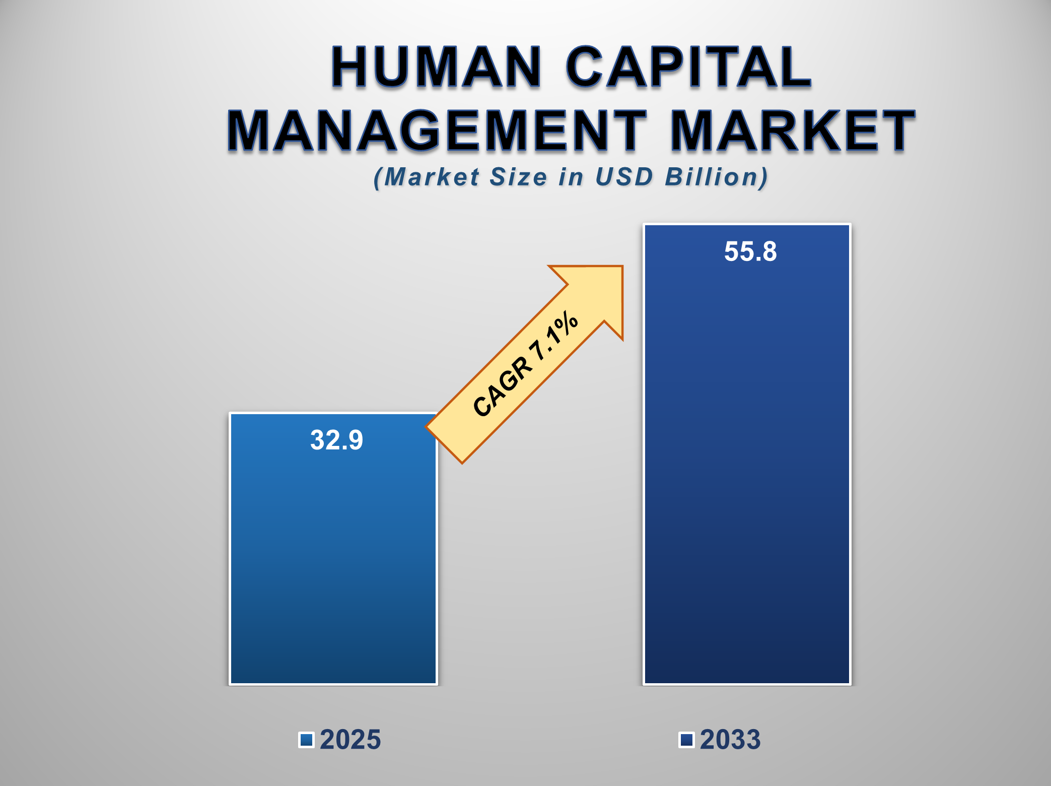 The Human Capital Management (HCM) Market is projected to reach USD 55.8 billion by 2033, up from USD 32.9 billion in 2025, registering a CAGR of 7.1% during 2025–2033. Market growth is driven by the rising need for efficient workforce management, digital HR transformation, and strategic talent acquisition across industries.