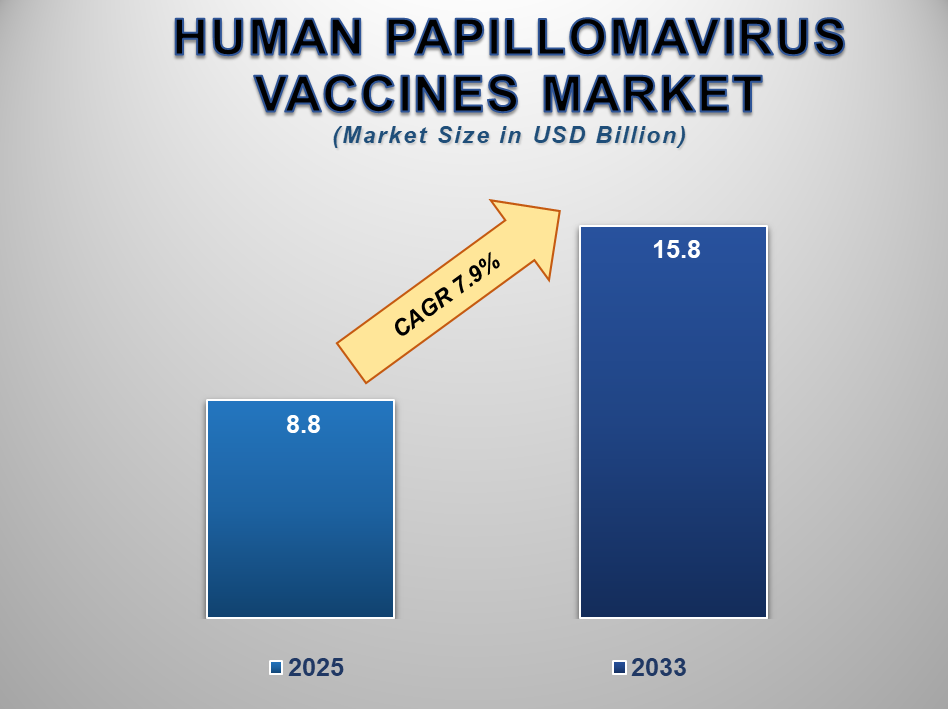The Global Human Papillomavirus (HPV) Vaccines Market size is witnessing significant expansion, driven by increasing awareness of HPV-associated diseases and rising global vaccination initiatives. According to market analysis, the HPV vaccines market is projected to grow from USD 8.8 billion in 2025 to USD 15.8 billion by 2033, registering a compound annual growth rate (CAGR) of 7.9% during the forecast period.
