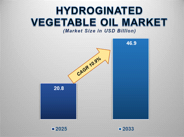 The hydrogenated vegetable oil market is anticipated to experience substantial growth from 2025 to 2033. The growing global focus on reducing carbon emissions and transitioning to renewable energy sources is a key factor that is estimated to boost the hydrotreated vegetable oil (HVO) market demand in the next few years. With an estimated valuation of approximately USD 20.8 billion in 2025, the market is expected to reach USD 46.9 billion by 2033, registering a robust compound annual growth rate (CAGR) of 10.9% over the decade.