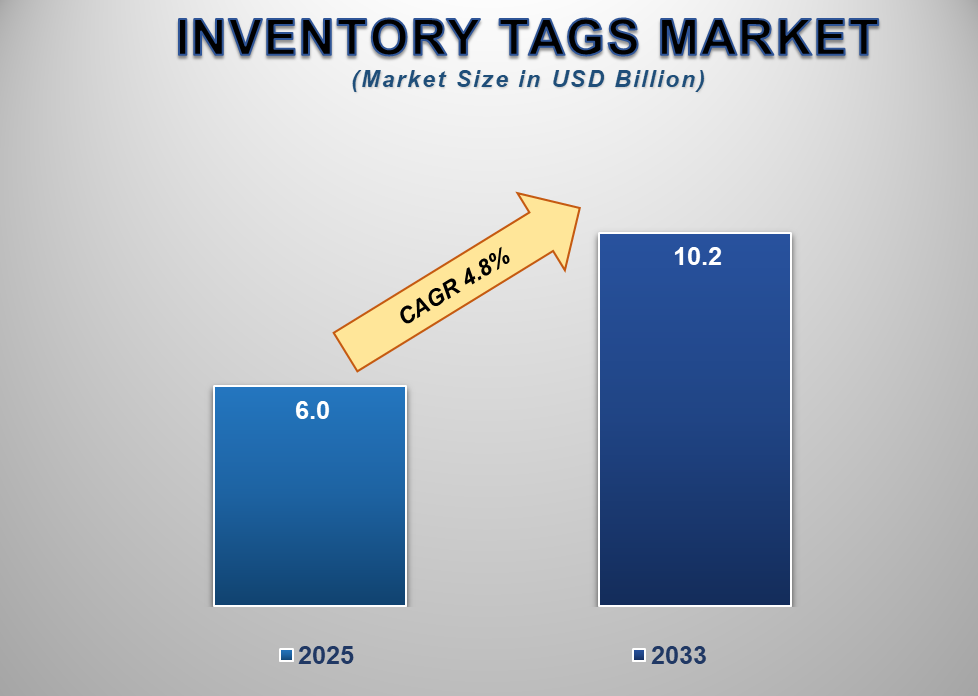 The global Inventory Tags market size is poised for steady growth, with the market size valued at USD 6.0 billion in 2025 and forecasted to reach approximately USD 10.2 billion by 2033, expanding at a compound annual growth rate (CAGR) of 4.8% during the forecast period. Inventory tags are essential components in modern asset management, supply chain operations, and inventory tracking across various industries such as retail, manufacturing, healthcare, logistics, and government sectors. These tags come in various material types, including plastic, paper, and metal, and are embedded with technologies such as RFID, barcodes, and QR codes to enable efficient product identification, monitoring, and reporting.