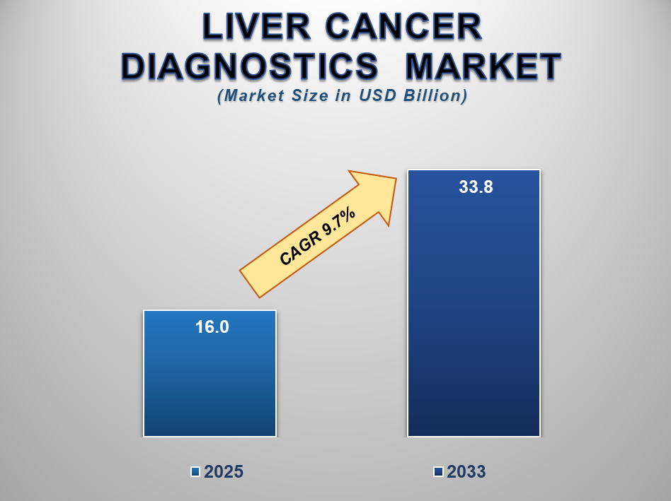 The Global Liver Cancer Diagnostics Market size is experiencing robust expansion, driven by rising liver cancer incidence, advancements in diagnostic technologies, and increasing healthcare awareness worldwide. According to market analysis, the global liver cancer diagnostics market is forecasted to grow from USD 16.0 billion in 2025 to USD 33.8 billion by 2033, registering a strong compound annual growth rate (CAGR) of 9.7% during the forecast period.