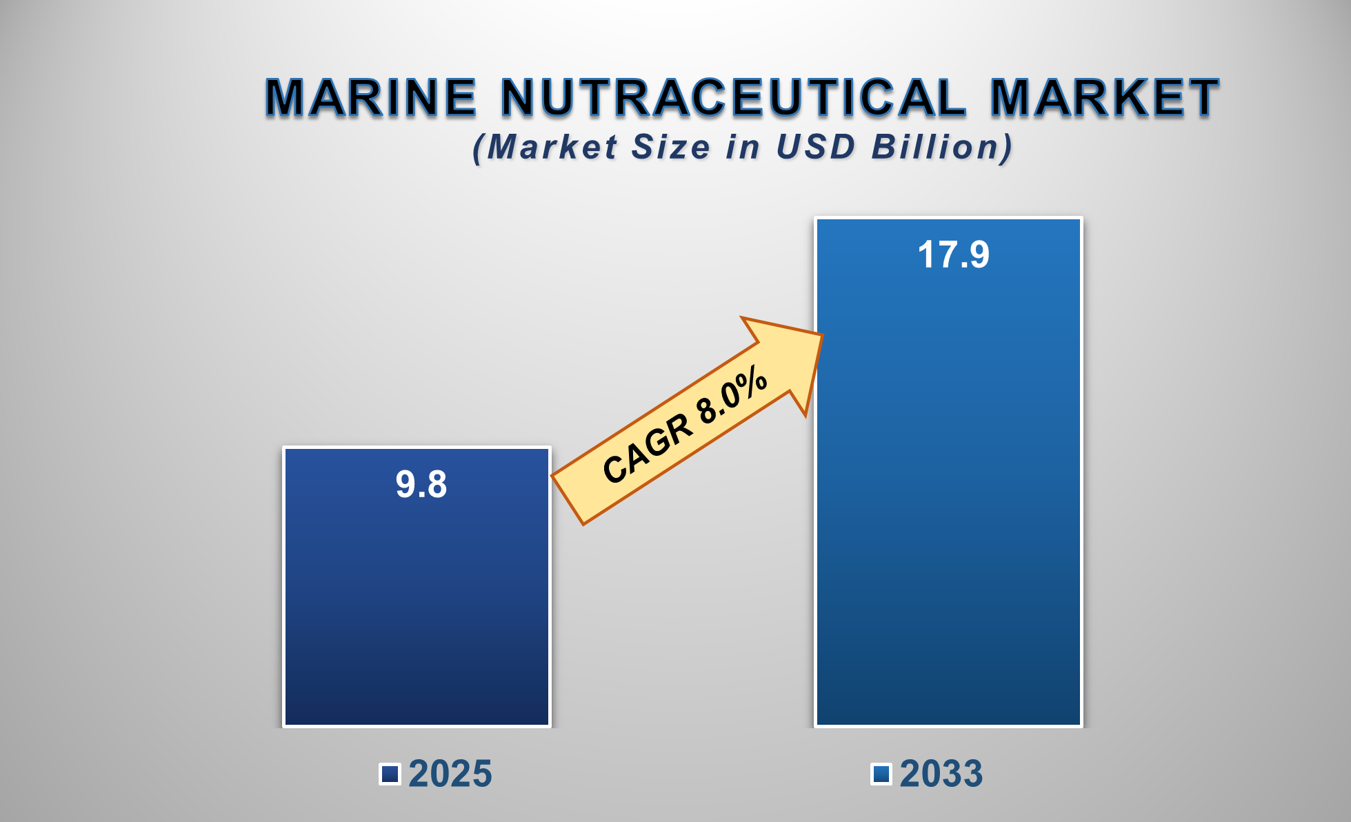 The Marine Nutraceutical Market is set for robust growth from 2025 to 2033, propelled by rising consumer awareness of preventive healthcare, the proven health benefits of marine-derived ingredients, and growing disposable incomes. The market is projected to be valued at approximately USD 9.8 billion in 2025 and is forecasted to reach nearly USD 17.9 billion by 2033, exhibiting a compound annual growth rate (CAGR) of 8.0% during this period.