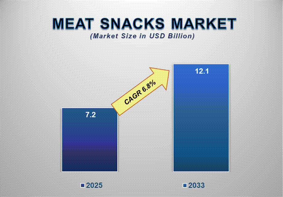 The Meat Snacks Market size is anticipated to experience substantial growth from 2025 to 2033, fueled by growing demand for convenience food products and robust demand for animal protein. With an estimated valuation of approximately USD 7.2 billion in 2025, the market is expected to reach USD 12.1 billion by 2033, registering a robust compound annual growth rate (CAGR) of 6.8% over the decade.