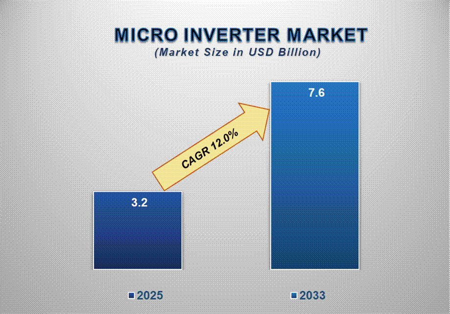The global micro inverter market size is projected to grow substantially from 2025 to 2033 due to rising solar photovoltaic (PV) adoption, demand for module-level power electronics (MLPE), and the shift towards smarter, more efficient energy systems. Valued at approximately USD 3.2 billion in 2025, the market is expected to reach USD 7.6 billion by 2033, expanding at a robust CAGR of 12.0% during the forecast period.