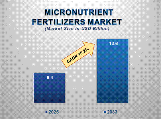 The global micronutrient fertilizers market is expected to register substantial growth between 2025 and 2033, driven by increasing soil micronutrient deficiencies, a growing focus on crop nutrition, and the need to boost agricultural productivity in the face of climate change. Valued at approximately USD 6.4 billion in 2025, the market is projected to reach USD 13.6 billion by 2033, growing at a CAGR of 10.2% during the forecast period.