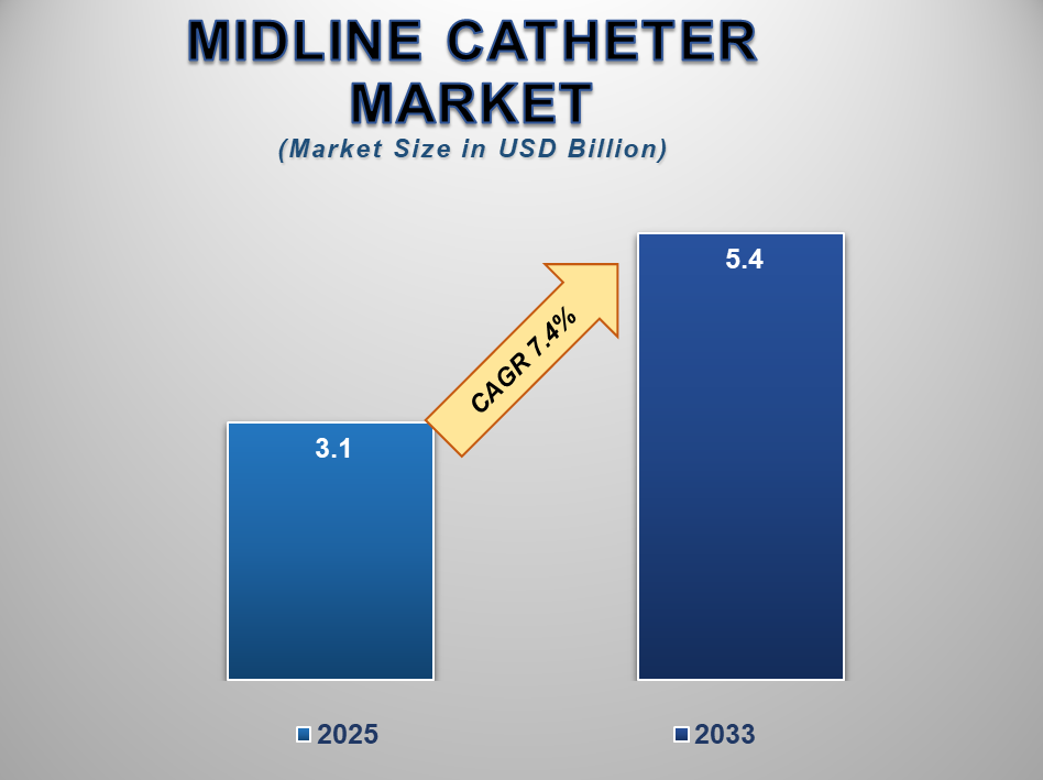 The Global Midline Catheter Market is witnessing strong growth, driven by the increasing use of minimally invasive devices for intravenous therapy, the rising prevalence of chronic illnesses requiring long-term IV medication, and growing hospital admissions worldwide. Valued at USD 3.1 billion in 2025, the market is projected to reach USD 5.4 billion by 2033, expanding at a CAGR of 7.4% during the forecast period.