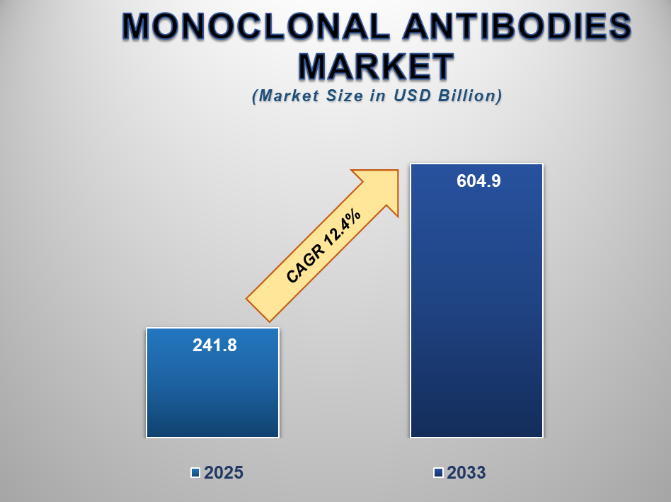 The global Monoclonal Antibodies Market is witnessing robust expansion, fueled by rapid advancements in biotechnology, increasing incidences of cancer and autoimmune diseases, and growing approvals of targeted biologic therapies. Valued at USD 241.8 billion in 2025, the market is projected to reach USD 604.9 billion by 2033, expanding at a CAGR of 12.4% during the forecast period.