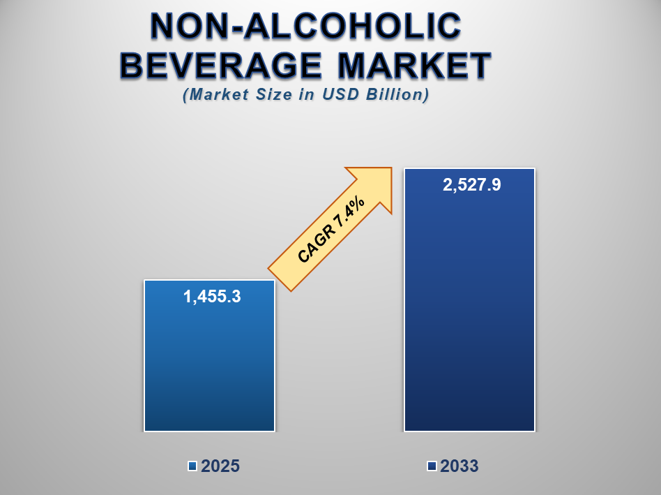The global Non-Alcoholic Beverage Market is witnessing robust expansion, driven by rising health consciousness, increasing demand for functional and fortified drinks, and shifting consumer preferences toward healthier alternatives to alcoholic beverages. Valued at USD 1,455.3 billion in 2025, the market is projected to reach USD 2,527.9 billion by 2033, growing at a CAGR of 7.4% during the forecast period.