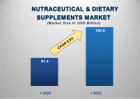 The global Nutraceutical & Dietary Supplements market is undergoing rapid expansion due to increasing consumer health consciousness, rising incidence of lifestyle-related diseases, and greater emphasis on preventive healthcare. The market was valued at USD 91.4 billion in 2025 and is projected to reach USD 190.0 billion by 2033, growing at a CAGR of 9.9% during the forecast period.