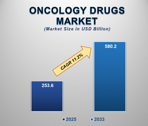 Oncology Drugs Market Size and Forecast (2025 - 2033), Global and Regional Growth, Trend, Share and Industry Analysis Report Coverage: By Therapy Type (Chemotherapy, Targeted Therapy, Immunotherapy (Biologic Therapy), Hormonal Therapy and Others (Radiopharmaceuticals, Biosimilars)); By Drug Class (Alkylating Agents, Antimetabolites, Mitotic Inhibitors, Cytotoxic Antibiotics, Monoclonal Antibodies, Tyrosine Kinase Inhibitors and Others); Cancer Type (Breast Cancer, Lung Cancer, Colorectal Cancer, Prostate Cancer, Blood Cancer, Skin Cancer, Ovarian Cancer, Pancreatic Cancer and Other Cancers)); By Dosage Form (Oral, Injectable, and Others); By Distribution Channel (Hospital Pharmacies, Retail Pharmacies, and Online Pharmacies) and Geography