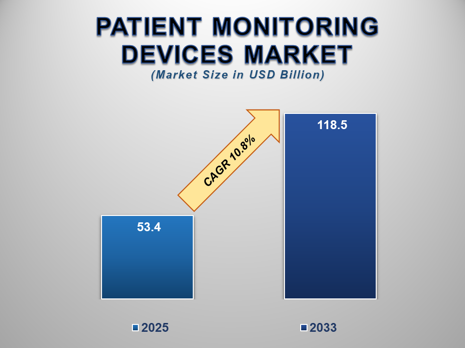 The global patient monitoring devices market was valued at USD 53.4 billion in 2025 and is expected to reach USD 118.5 billion by 2033, growing at a CAGR of 10.8% during the forecast period. Patient monitoring devices are critical tools in modern healthcare, enabling continuous or periodic assessment of vital signs and health parameters for patients in hospital, home, or ambulatory settings. These devices play a pivotal role in the diagnosis, prevention, and management of chronic diseases, post-operative care, and acute conditions.